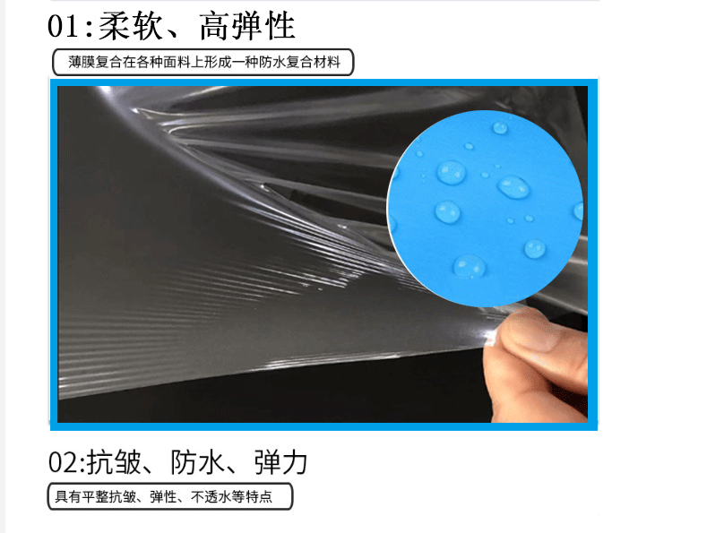柔軟。耐沖性高,伸長率大,拉伸性優(yōu)。透明性能優(yōu)良,防水透氣,無毒環(huán)保。